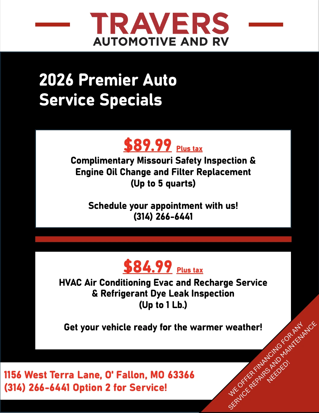 For RV drivers in the O’Fallon, MO, area needing fast, premium-quality, and affordable RV repair, trust the experts at Travers STL RV Service to make things right. With master RV / Camper technicians who are eager to take on any size job, our staff are ready to bring in all makes and models of Class A, B and C motorhomes, travel trailers, fifth wheels, and toy haulers. Unlike some of the other folks in town, we assure that each RV model we work on comes out looking and performing as good as new, all for a fair price. If you have an aging RV that needs more serious overhaul, we can handle it. If you have a newer RV that only needs annual maintenance, we’ve also got you covered. Travers STL RV Service is also a premier source of parts and replacement appointments for recreational models, so we try and do everything from our state-of-the-art O’Fallon facility. From auto body painting to advanced system maintenance and overhaul, we are the area’s go-to RV solution. Give us a call (636) 542-4567 or swing by 1156 West Terra Ln. O'Fallon, MO 63366 to get started.