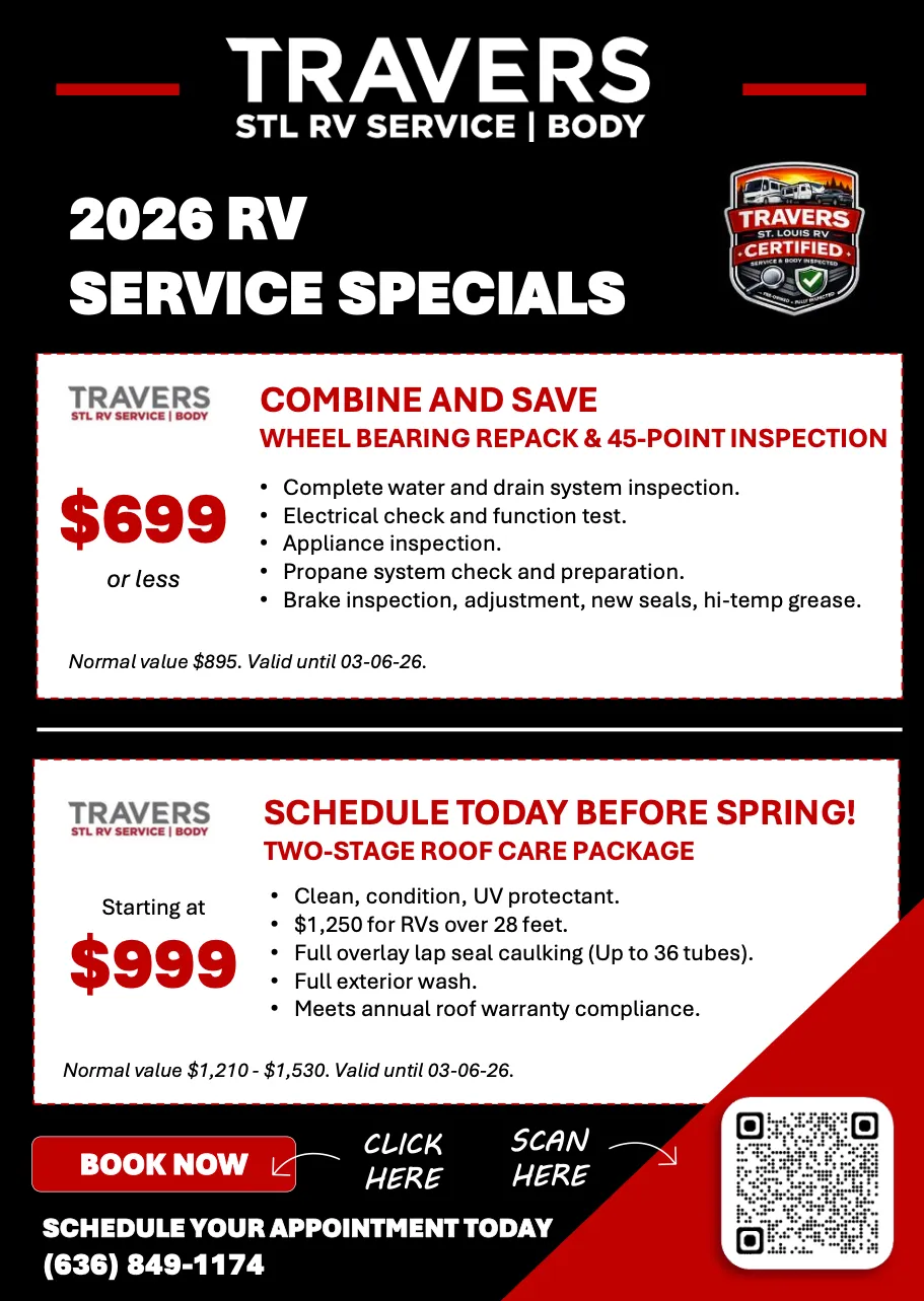 No matter the make, model, or predicament, Travers STL RV Service is the best source of RV repairs, part replacements, body work, paint, and general maintenance. With years of premier automotive services and investment in cutting-edge training, repair tools, service bays, and OEM parts, you can bet on us to do an A-plus job for a fair price. Many RV drivers find themselves having to travel long ways to their official dealership, which means even more time, money, and energy away from their important and busy schedule. When you choose us for your RV repair, we’ll make sure we are fast, friendly, and affordable, and we can help get you in for annual and bi-annual services as needed. We do a bit of everything around here.